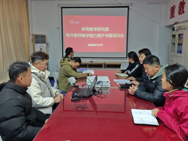 为落实学校督导教学检查反馈要求,提升青年教师教学素养,2025年11月24日,体育教学研究部组织开展青年教师教学能力提升专题培训会。体育部副主任王健、技能教研室主任董英辉、艺术教研室任晓冬、体育部督导组组长张馨娇、体质测试主任安大庆,教师代表祝河德、刘晓坤、丁鹏祥、王鹏等参与本次会议。